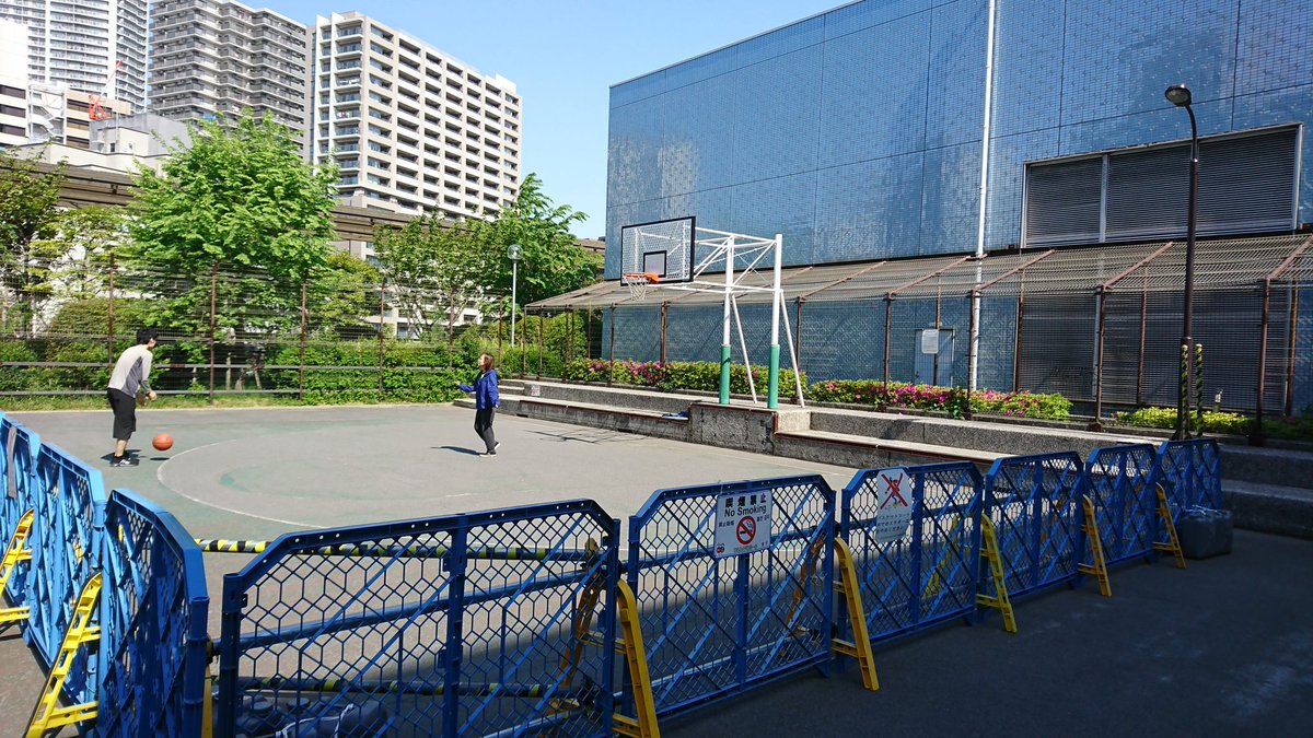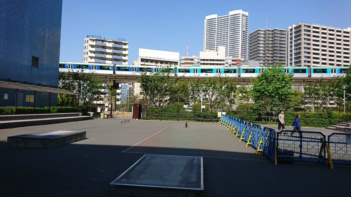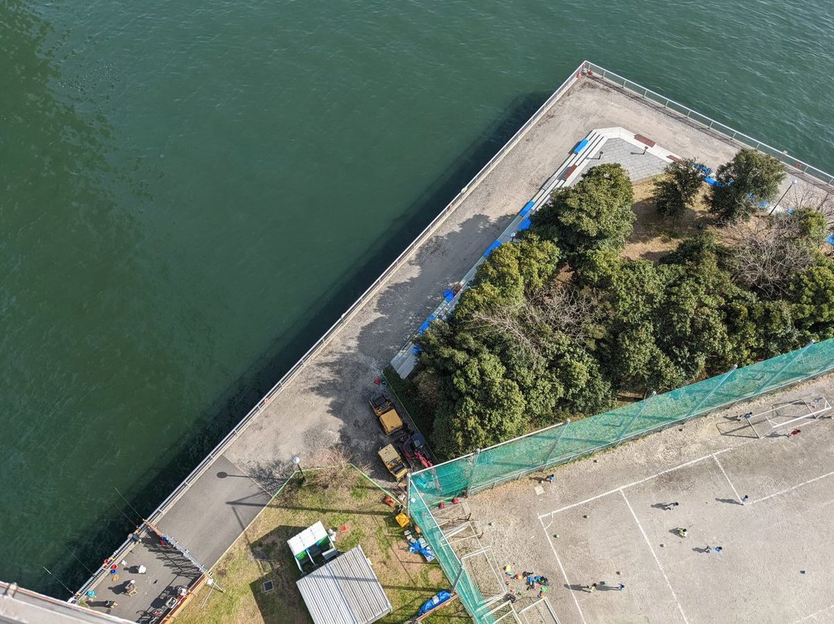 レインボーブリッジから撮った写真のほうがわかりやすいかな。一部青シートでまだ新設されたベンチが覆われている。2枚目左下のつり客のあたりが現状まだ利用可能なところ。まだ全体的に舗装はされていない。まぁあと1週間あるし。 pic.twitter.com/lV9a5F7VJx 2022-03-21 18:47:00