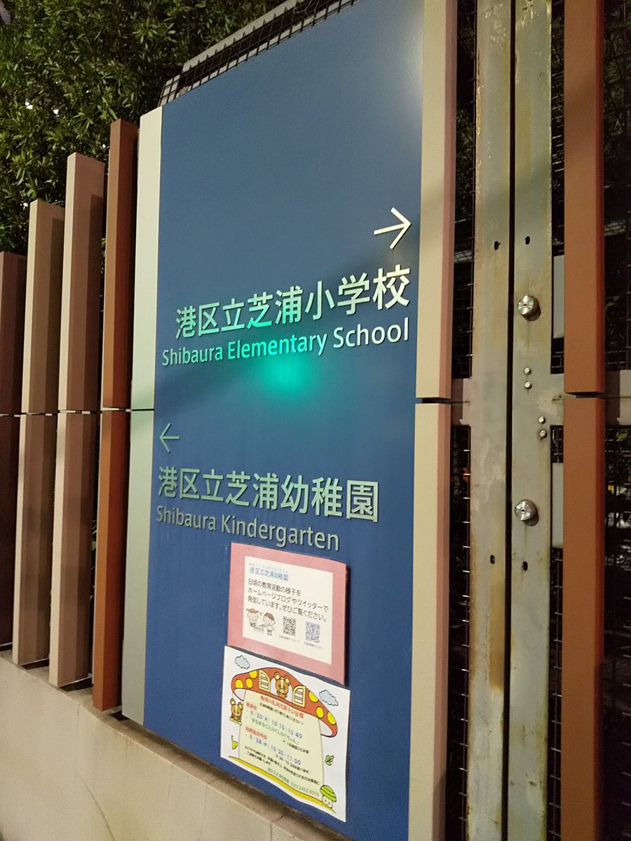 2012年8月3日13時52分。「高浜橋北詰交差点」より、「芝浦小学校」を撮影しました。「→ 港区立芝浦小学校 ←港区立芝浦幼稚園」などと書かれた案内も写っています。 -