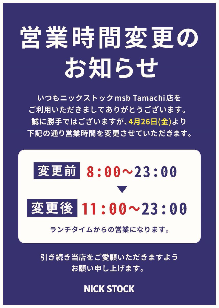 【営業時間変更のお知らせ(msb Tamachi店)】いつも「ニックストック msb Tamachi店」をご利用頂きありがとうございます。誠に勝手ではございますが、4月26日(金)より営業時間を変更させて頂きます。引き続き、ご愛顧いただきますようお願い申し上げます。#ニックストック #nickstock #田町 pic.twitter.com/4s0R3U40to 2019-04-24 10:10:00