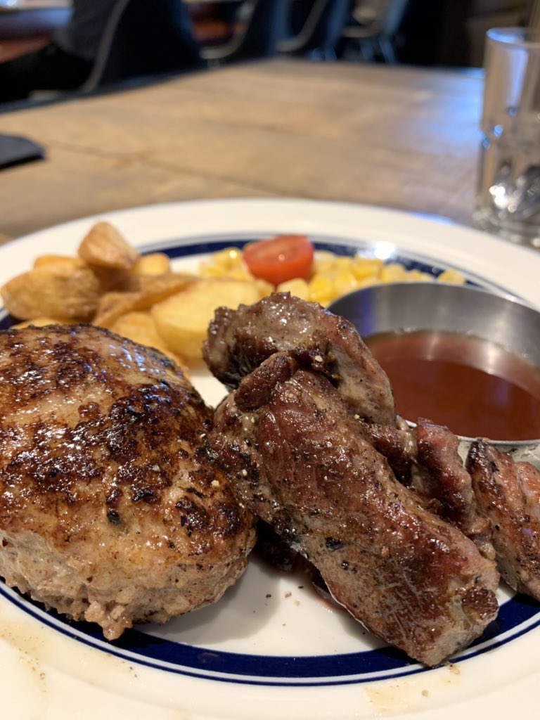 🎫チケットを受取りがてら、久しぶりに再会の軽メシ予定がちょい肉祭り🥩デザートの代わりにハンバーグを追加したのは初めてだ(笑)