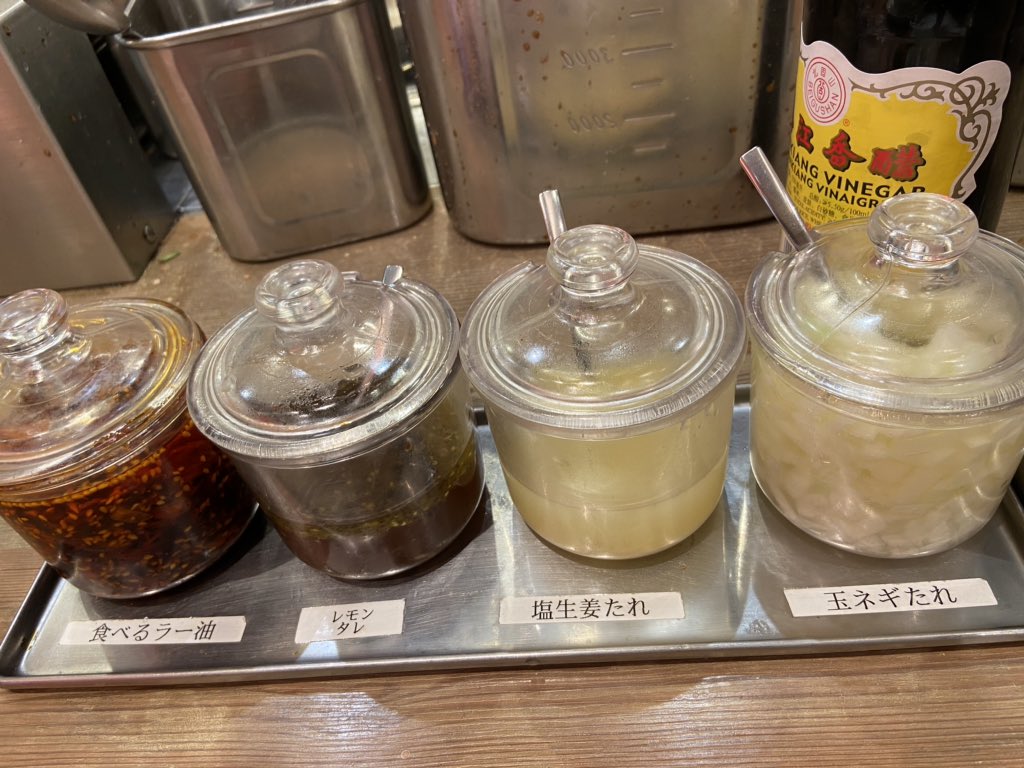 卓上は黒酢、お酢、胡椒、生姜、玉ねぎ甘酢、食べるラー油など選り取り見取り
