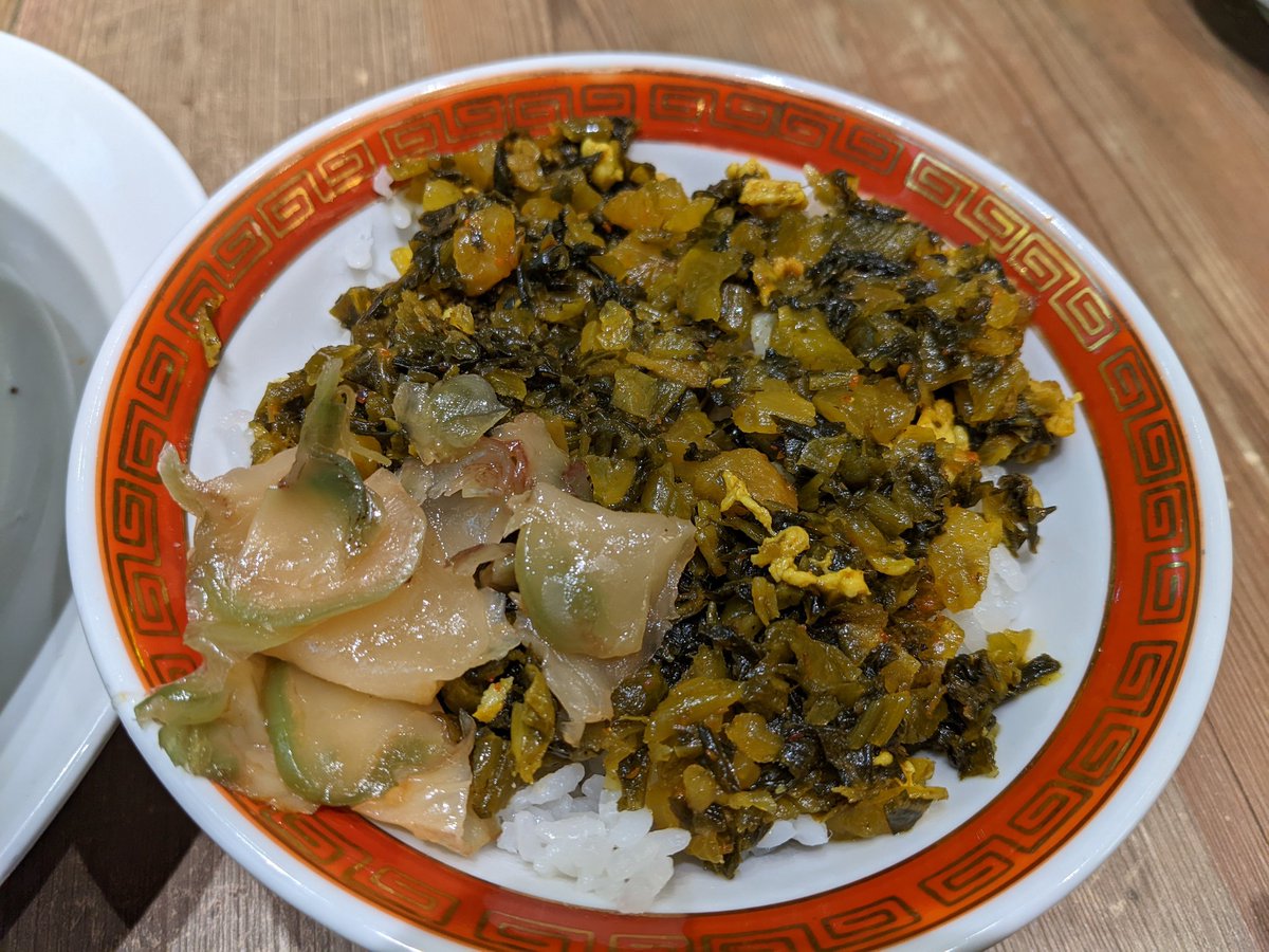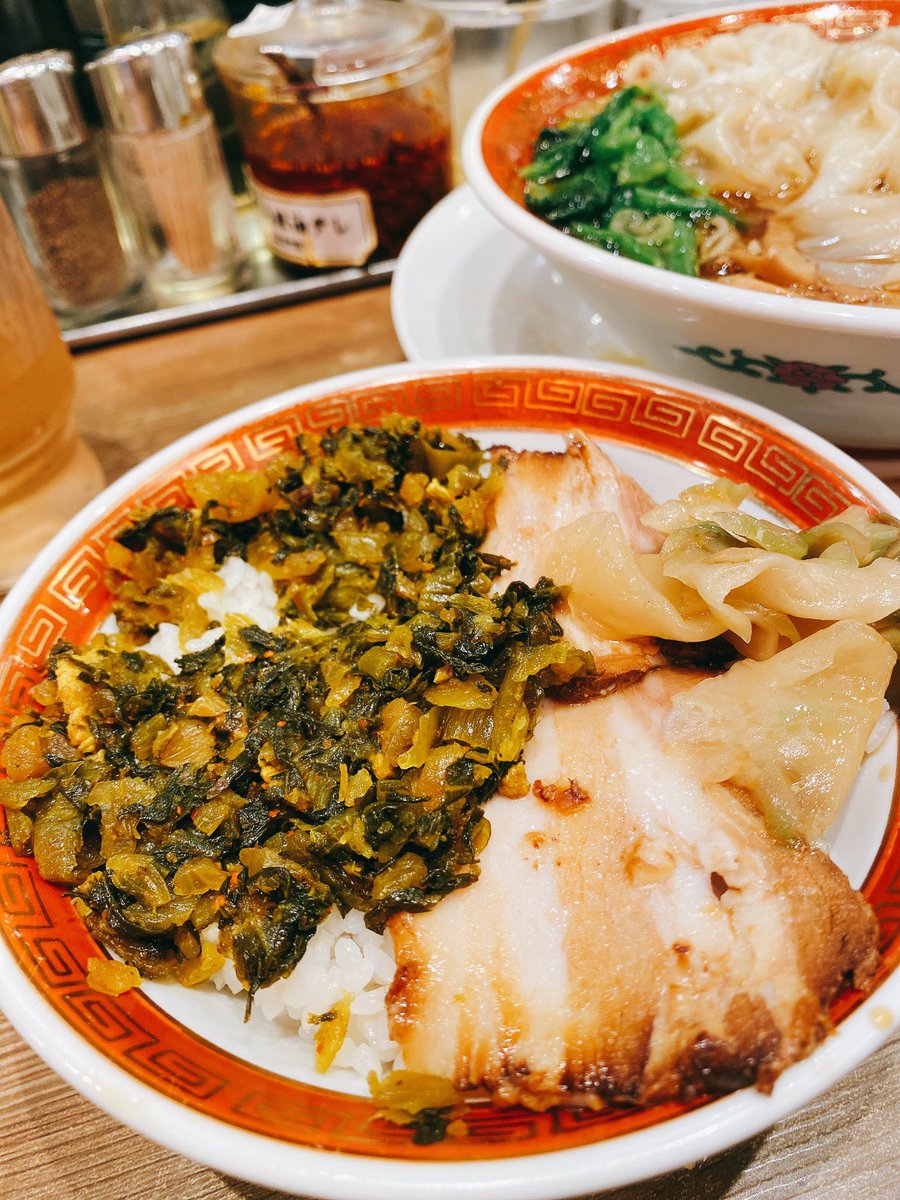 ランチメニューの雲呑麺セットをルーロー飯でいただきました。でも、ルーロー飯というより高菜ご飯かな。雲呑麺の雲呑が多すぎて...