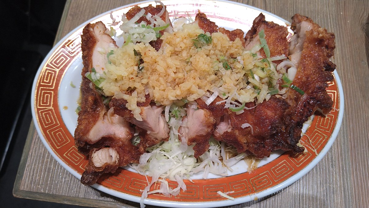 看板メニューのワンタン麺(醤油味)が美味しいんで、是非食べてください。あとはこの油淋鶏がでかくで歯応えもザクザクして絶注の一品。