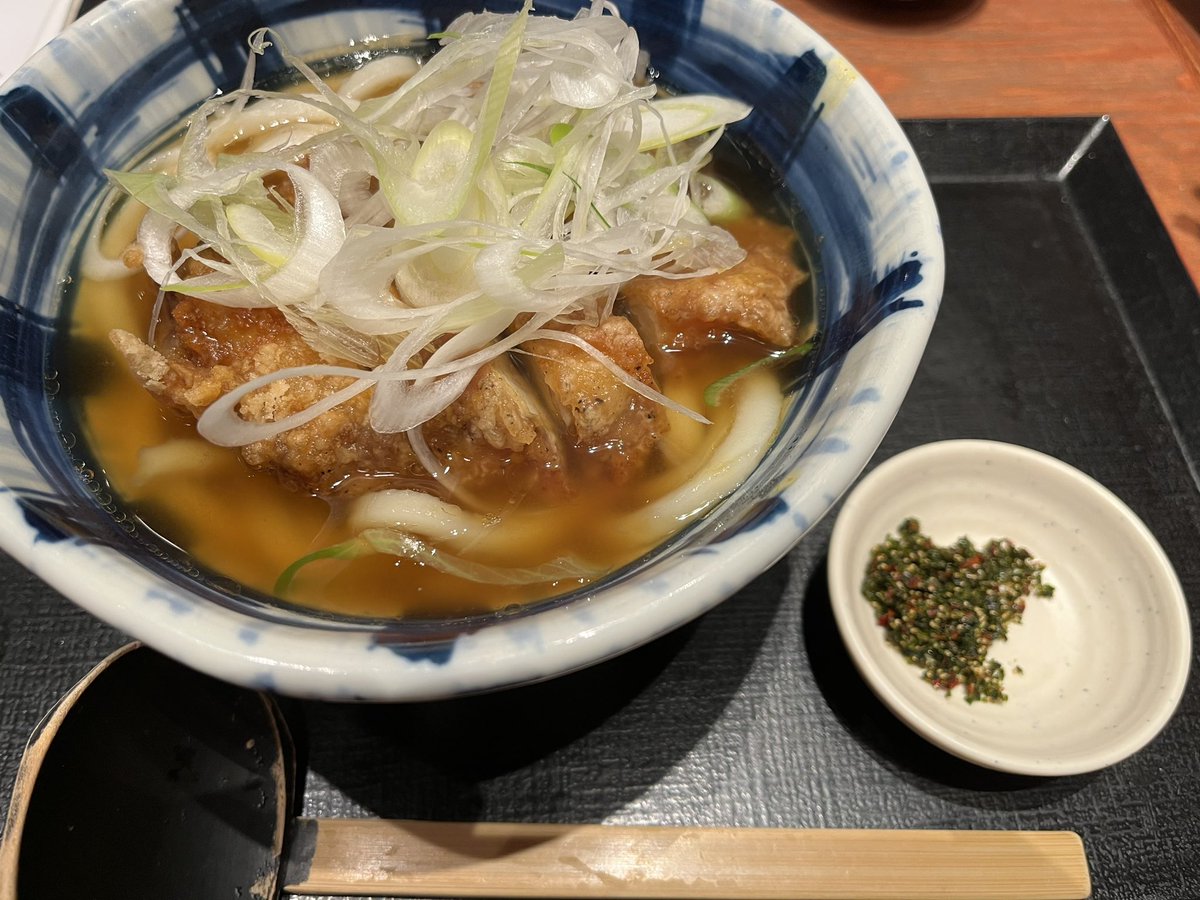 #田町、芝浦側のmsb田町ステーションタワーSにある、うどん 骨付き揚げ鶏 こびんちょ にて、名物 鶏パーコーうどん を食べました!