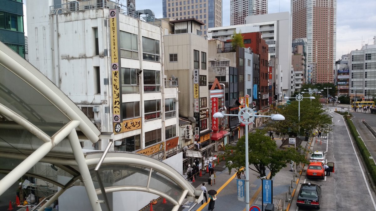 2008年5月27日12時56分。「JR 田町駅 芝浦口(東口)」より、「なぎさ通り」を撮影しました。左端には、「善波ビル」屋上にある小屋も写っています。 -
