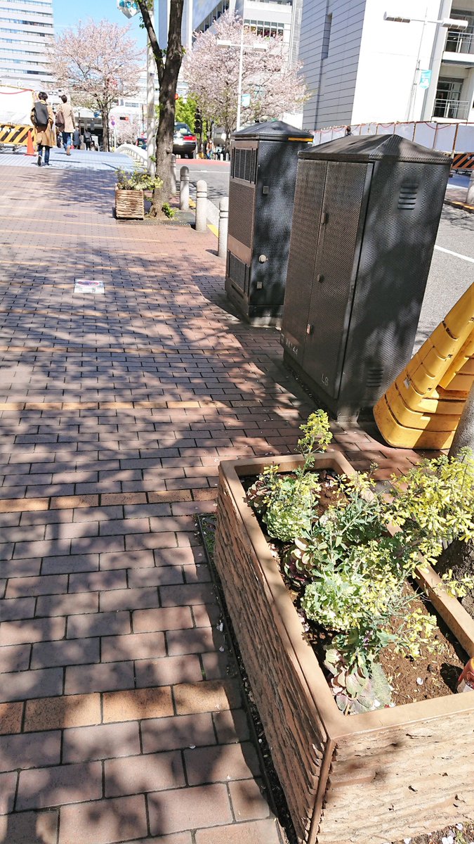 2015年3月30日13時36分。「JR 田町駅 芝浦口(東口)」へ向かって、「なぎさ通り」を撮影しました。右手前には、「日立チェーンストール」加盟店の「ひるかわでんき」も写っています。 -