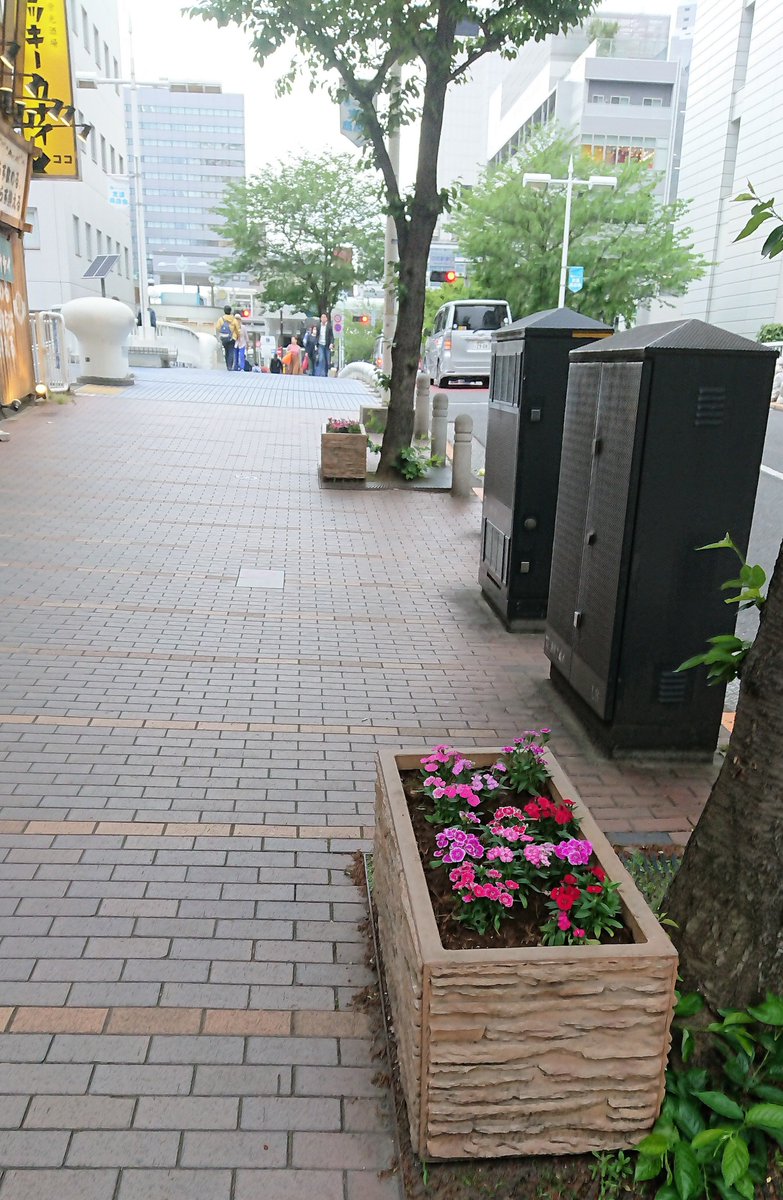 2019年5月30日13時47分。「JR 田町駅 芝浦口(東口)」を背にして、「なぎさ通り」の歩道を撮影しました。右端には、街灯に吊るされた「運河のある街 芝浦商店会」のタペストリーも写っています。 -