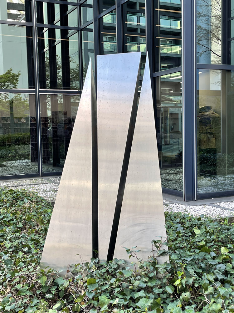 【港区 芝浦スクエアビル】静岡県生まれで京都在住の造形作家。1987年制作の作品。鋭利な幾何学形状のオブジェです。昨日紹介した作品の裏側の公園側にあります。 #パブリックアート 内田晴之「異・空間87-2」