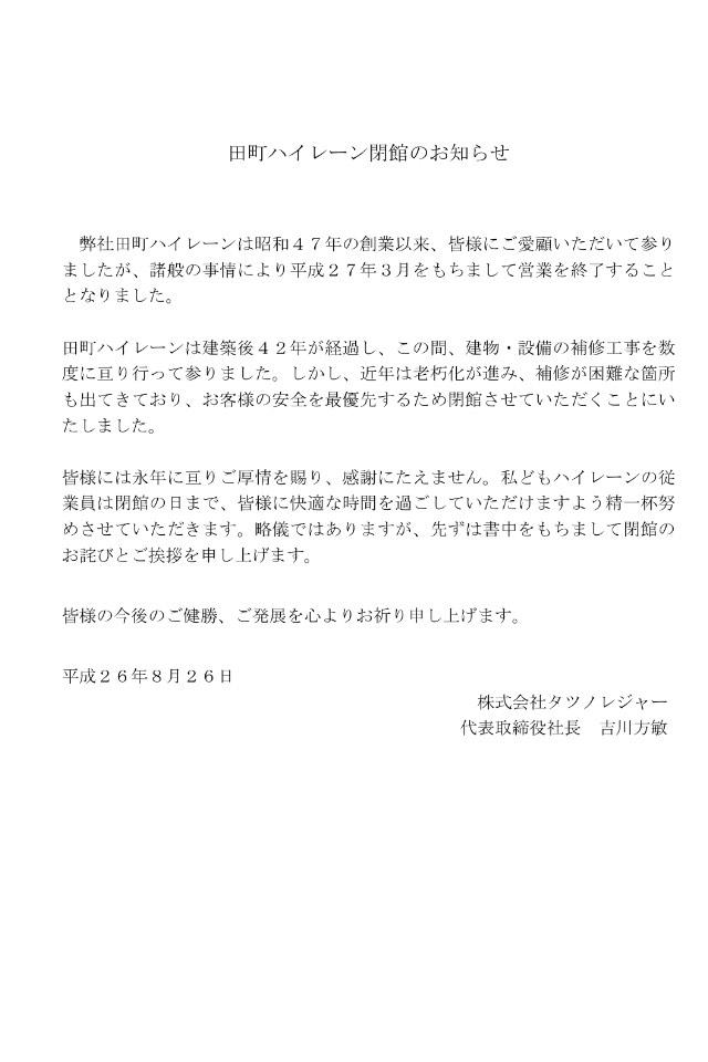 「株式会社タツノレジャー」は、2015 年 3 月 29 日に「田町ハイレーン」を閉館しました。