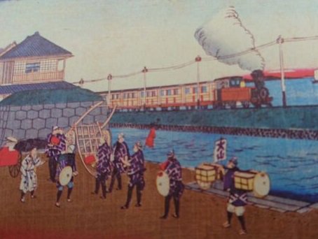 碑の上の1号機関車がかつて走行していた高輪ゲートウェイ駅付近。