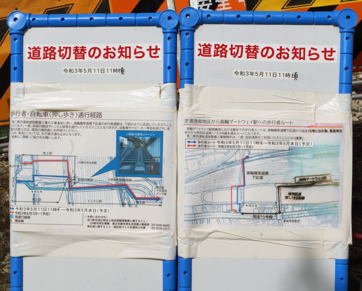 5/11から高輪側が迂回通路に切り替えられた高輪橋架道橋下区道、6/1からさらに別の場所へ迂回するとのこと。いまの迂回通路、途中で高輪築堤が見えるけど、見納めかな…?