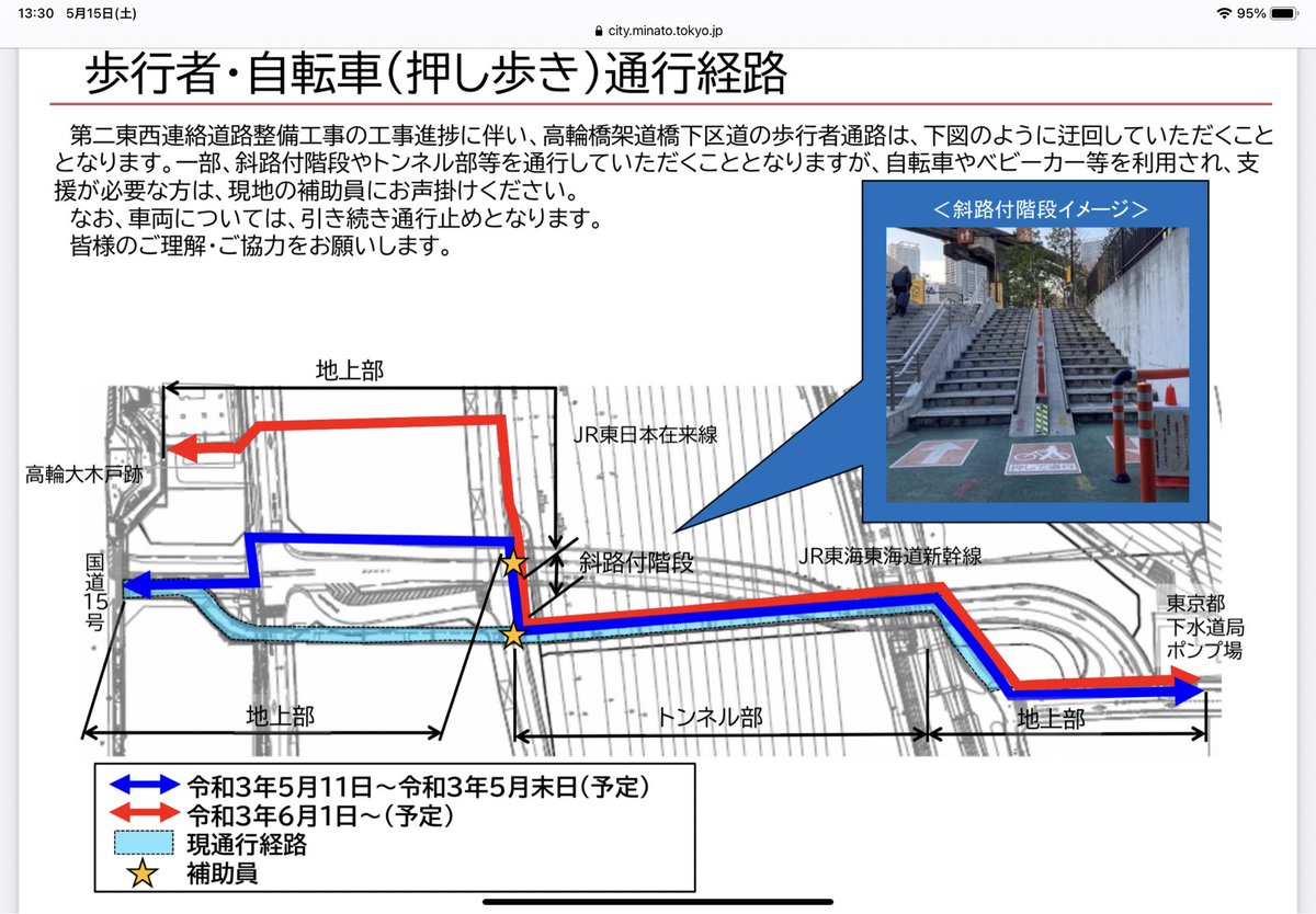 東京鉄道遺産、高輪築堤・高輪橋架道橋下区道、高輪築堤の一部である?高輪橋架道橋下区道ですが、今月5月11日11時頃から5月末までが青線、6月1日以降は赤線のルートに歩行者・自転車通路が付け替えとなり❝タクシーの提灯殺し❞と言われた高さ1.5ⅿの通路を全区間利用出来るのも、今の内みたいですね pic.twitter.com/ZqTa9lcqik 2021-05-05 23:21:00