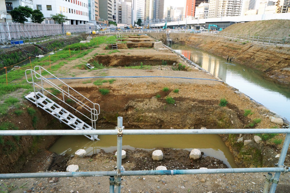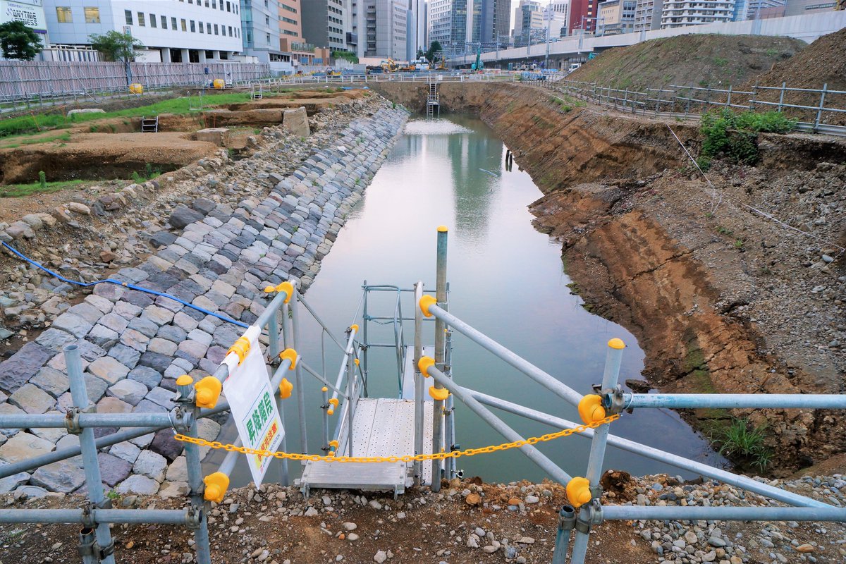 6/1から高輪橋架道橋下区道の仮設通路が付け替わって別の高輪築堤が見えるようになった。でもなんかこの間と見え方が違うなと思ったら、これ雨水が溜まって水位が上がってるのか…!自然には引かないだろうし梅雨時期には困るな…(何に pic.twitter.com/8Fb01Qoz4I 2021-06-02 15:05:00