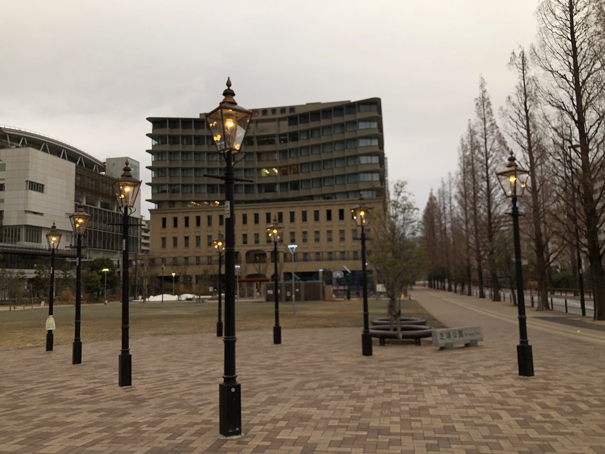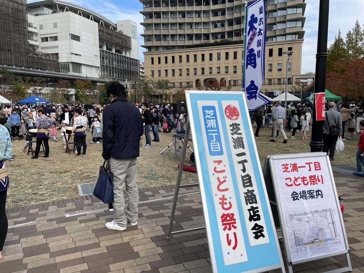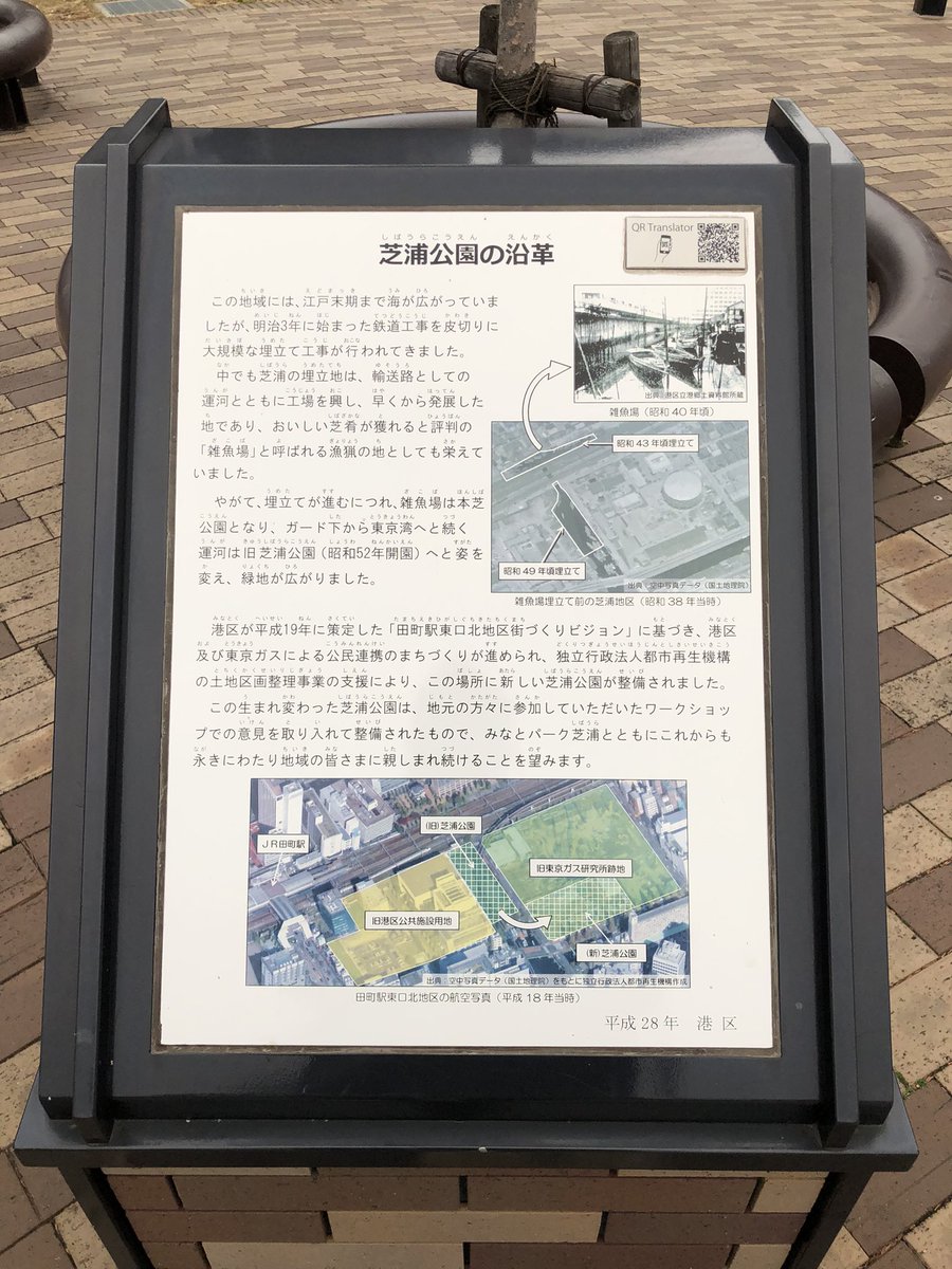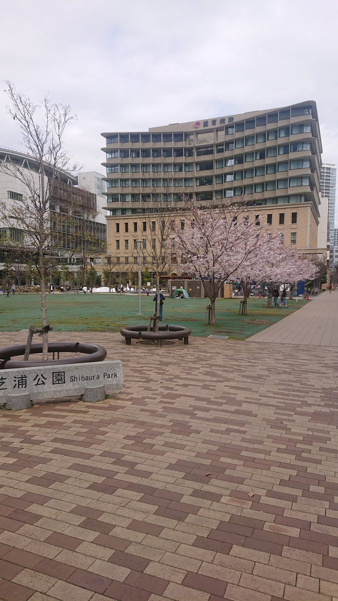 2009年5月25日15時11分。「芝浦運河通り」より、「芝浦公園」が新しく整備される前の(周囲を白色工事パネルで覆われている)様子を撮影しました。中央左奥には 35 階建て オフィスビル「グランパークタワー」が、左奥には 28 階建ての賃貸レジデンス「グランパークハイツ」も写っています。