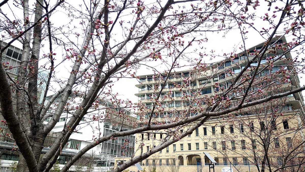 2014年3月11日13時50分。「芝浦運河通り」より、新築工事中の港区複合施設「みなとパーク芝浦」を撮影しました。右奥には、同じく新築工事中の「愛育病院」が写っています。手前側の「芝浦公園」となる場所も含めて、周囲が白色工事パネルで覆われている様子も写っています。 -